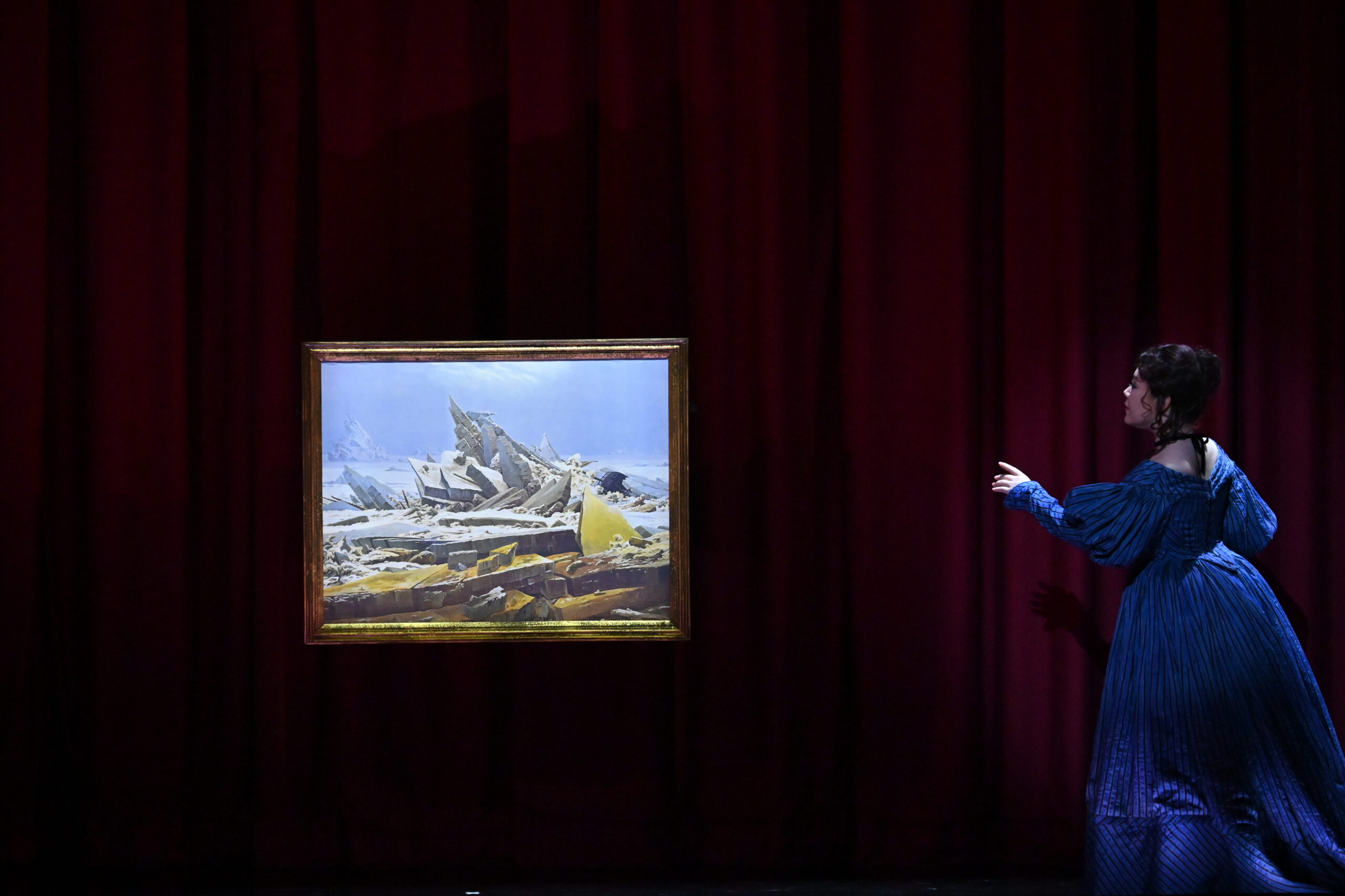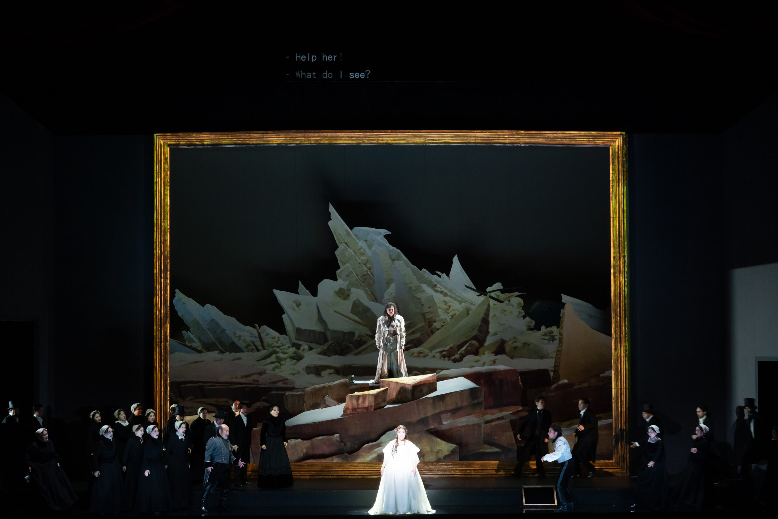 深作の演出は、『フィデリオ』のときとは別人のようで、ずっとスマートなものに仕上がっていた。ドイツのロマン主義を代表する画家カスパー・ダーヴィト・フリードリヒによる『氷海』を背景とした舞台で、ゼンタは冒頭からこの絵を抱えており、物語の行く末を見つめている以外に大きな読み替えなどはなく、極めてオーソドックスな部類に入る。ゼンタが絵を抱えながらずっと舞台にいるのだって、あのハリー・クプファーがずっと前にバイロイトでやっていた。