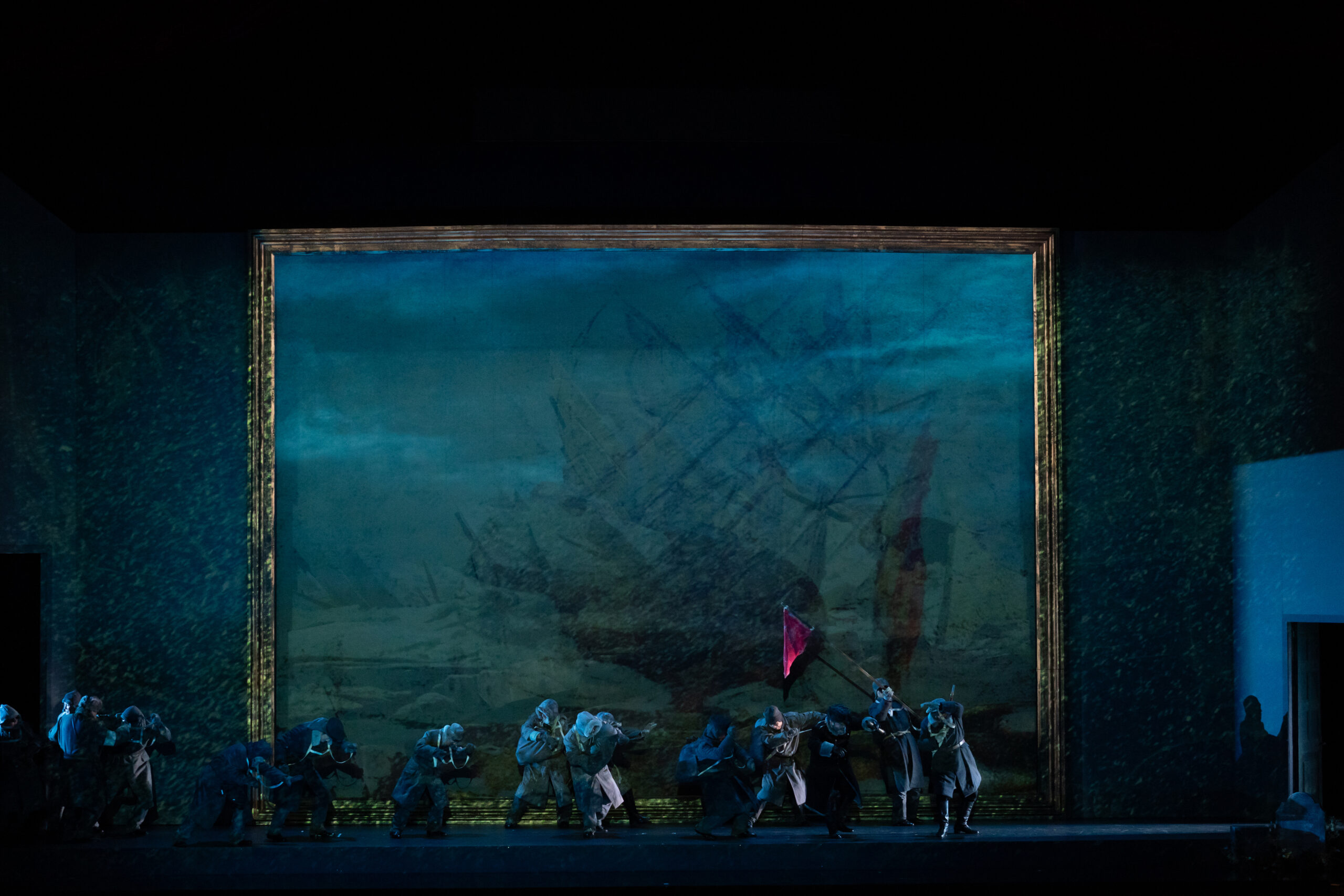 それは第3幕の前半で水夫たちが宴を催している最中にオランダ人の一行が現れるシーンである。水夫たちは燕尾服を着てグラスを片手に歌っていると、やおら客席から現代の普段着を着た人々が現れるのである。彼らは普段着というにはややみすぼらしく、大きな荷物を抱え、ライトで照らしながら不安そうに舞台へ上がる。彼らは「難民」なのである。たしかに行く当てもなくさまよい続ける人々とは、「難民」のことに違いない。こう定義すると、『さまよえるオランダ人』の物語が違って見えてくる。